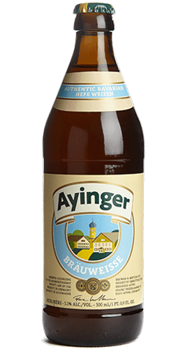 Ayinger Braüweisse es una cerveza alemana de trigo de alta fermentación, muy refrescante, de carácter floral, suave y achampanado a la vez. Las cervezas Hefeweizen son típicas cervezas bávaras sin filtrar que contienen muchas levaduras y a las que se les añade ácido láctico a lo largo del proceso de elaboración. Su principal ingrediente es el trigo sin maltear y su característica más destacable es su color dorado pálido y sus notas afrutadas y especiadas.