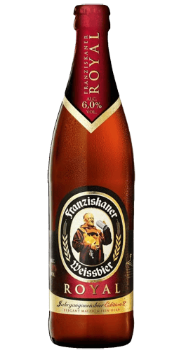 Franziskaner Royal es una cerveza de trigo alemana elaborada con ingredientes cuidadosamente seleccionados. Tiene un color ligeramente ámbar y espuma de color marfil, acompañado por un aroma a plátano maduro, melón dulce, albaricoque, higos y bayas oscuras.