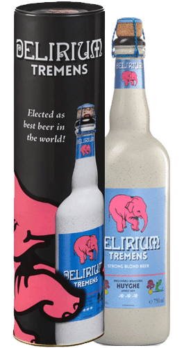 Delirium Tremens en formato botella de 75 cl con estuche de metal que muestra el elefante rosa