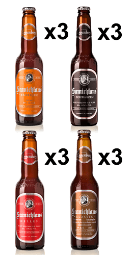 Este pack de cervezas contiene 12 botellas de 33 cl de la cerveza de Austria Samichlaus: 3 Samichlaus Schwarzes, 3 Samichlaus Classic, 3 Samichlaus Helles, Samichlaus Classic Barrique. No incluye estuche.