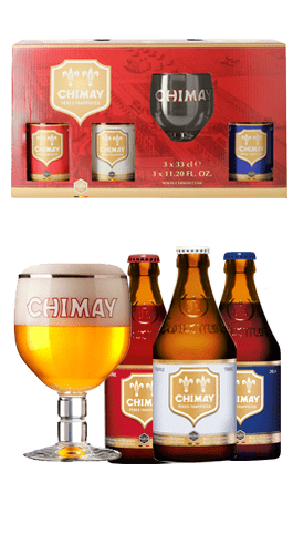 Este estuche contiene tres botellas de auténtica cerveza trapense Chimay de 33 cl (1 Azul, 1 Roja, y 1 Blanca) y una copa original diseñada especialmente para degustar la cerveza. Es un regalo de cerveza ideal para cualquier amante de la cerveza artesana belga.