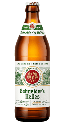 Schneider Helles es una cerveza Landbier alemana procedente del sur de Baviera, elaborada según la Ley de pureza bávara de 1516 con ingredientes 100% bávaros con procesos artesanales. Tiene un color dorado claro y un aroma equilibrado y es una cerveza rubia refrescante y muy bebible, con un sutil cuerpo maltoso y aromas florales de lúpulo.
