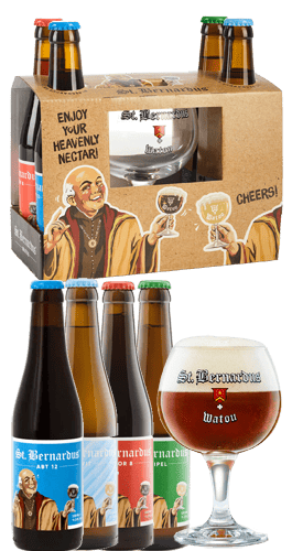 ¿Estás buscando cerveza para regalar? Este pack de cerveza de abadía St. Bernardus es el regalo perfecto para cualquier amante de la cerveza belga. Contiene 4 cervezas St Bernardus (1x Prior 8, 1x ABT 12, 1x Wit, 1 Tripel) y una copa diseñada especialmente para su degustación.