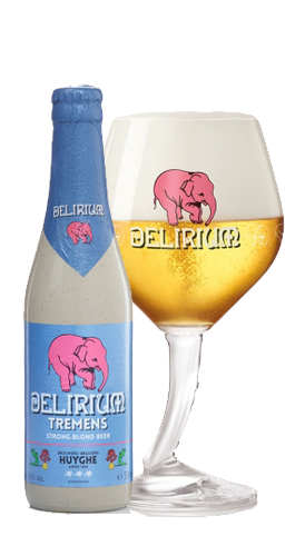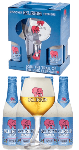 cerveza belga Delirium Tremens de 33 cl y una copa original diseñada especialmente para degustar esta cerveza.