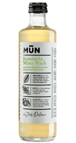 Mun Minty Peach es una bebida fermentada de té verde elaborada con menta, melocotón y una base de de té Lung Ching. El té de Lung Ching era muy popular entre los emperadores gracias a sus propiedades y solo se cosecha en primavera. Es una bebida bio probiótica sin refrigerar, con un 34% menos de azúcar que una marca normal, y ácidos orgánicos, antioxidantes, vitamina B y enzimas.
